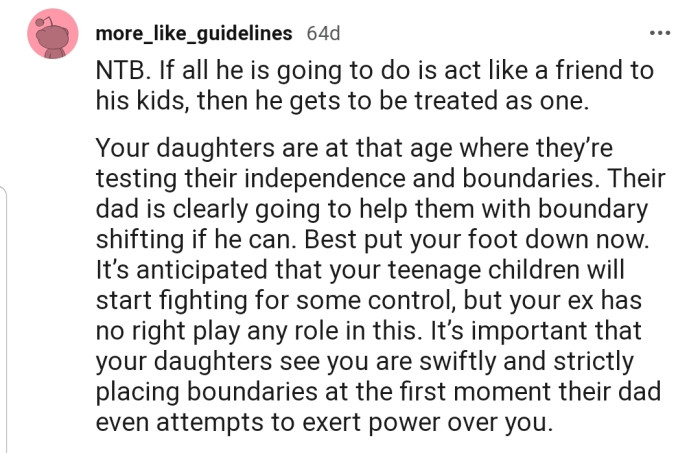 Reddit.com"It’s important that your daughters see you are swiftly and strictly placing boundaries at the first moment their dad even attempts to exert power over you."