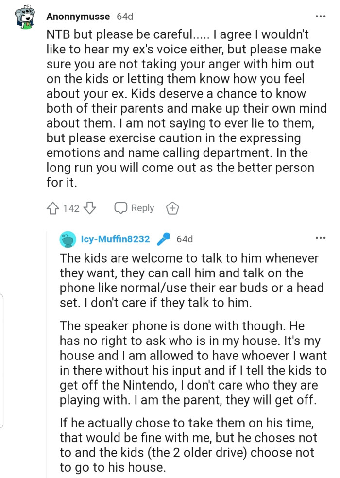 Reddit.comOP's kids enjoy talking to their dad (OP's ex) on speakerphone. This makes OP uncomfortable as they don't want to hear their ex's voice. In addition, their ex can hear what's happening in their house.