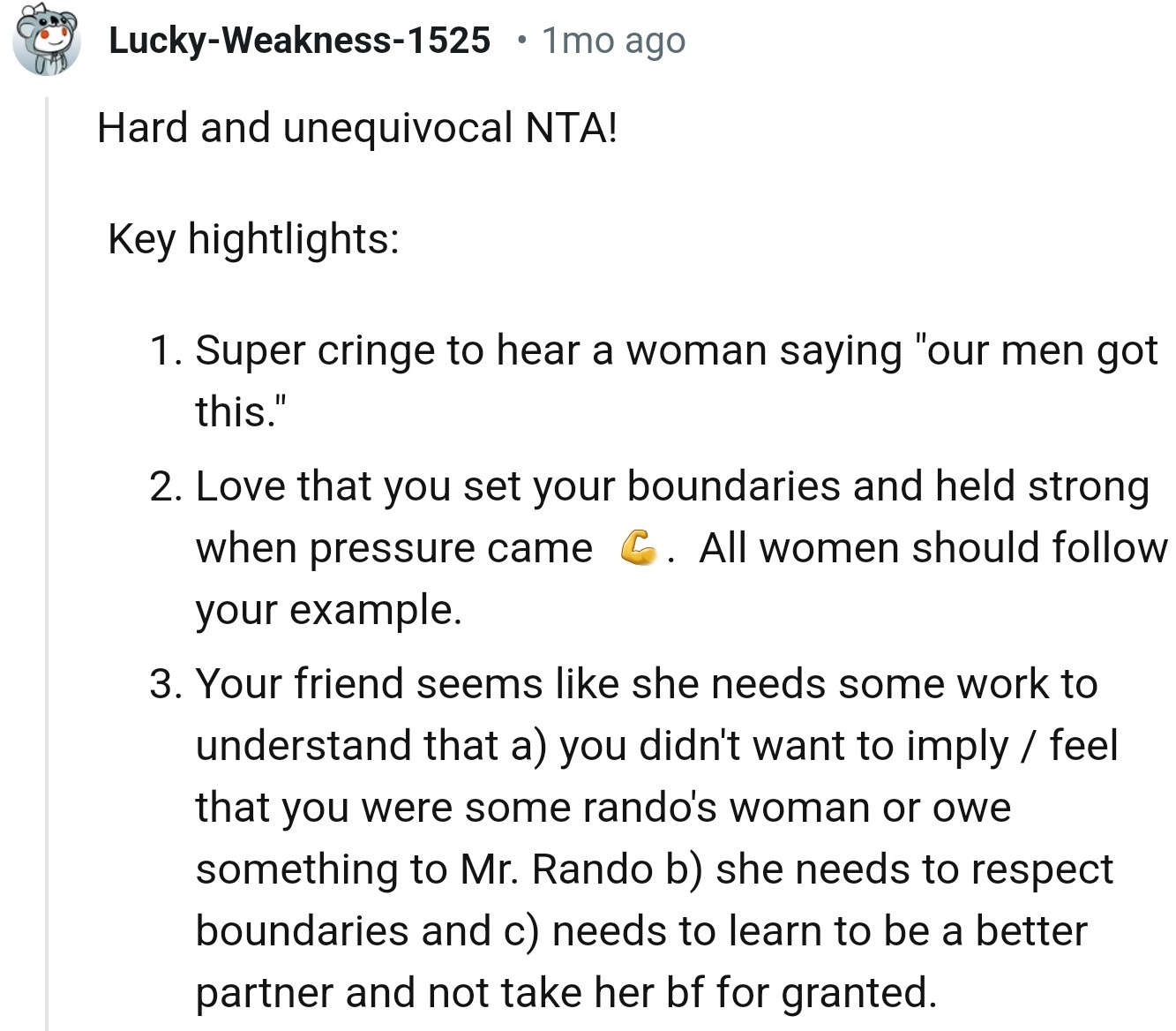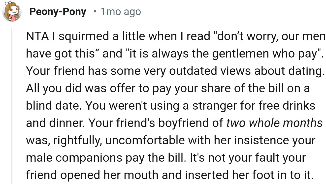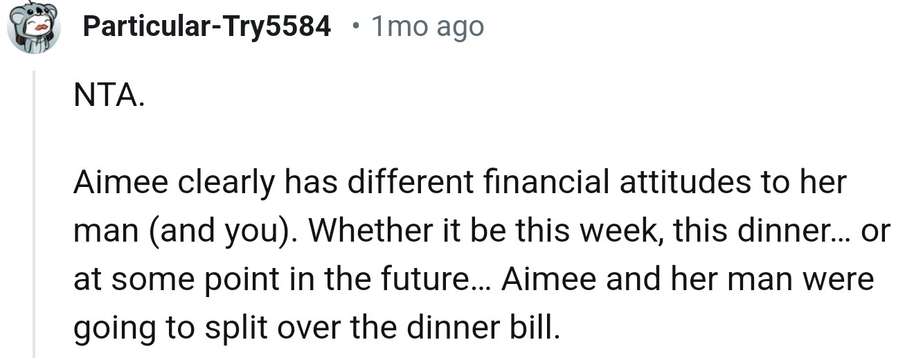 Aimee, ever the romantic, declared confidently that their dates would handle the check—but OP wasn’t on board since that wasn’t her style.