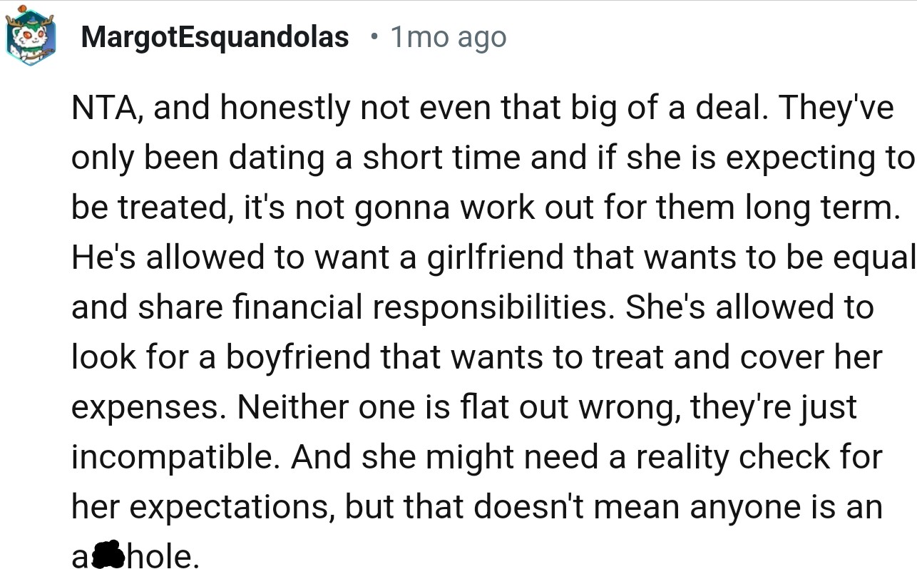 "He's allowed to want a girlfriend who wants to be equal and share financial responsibilities."