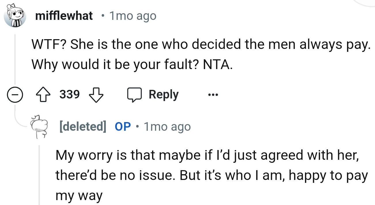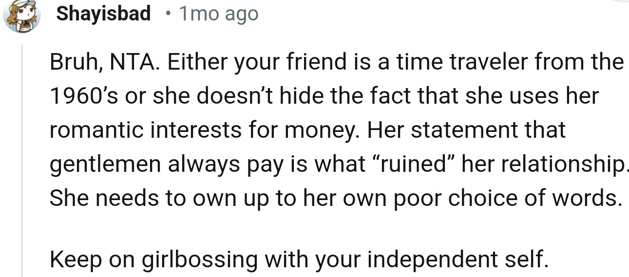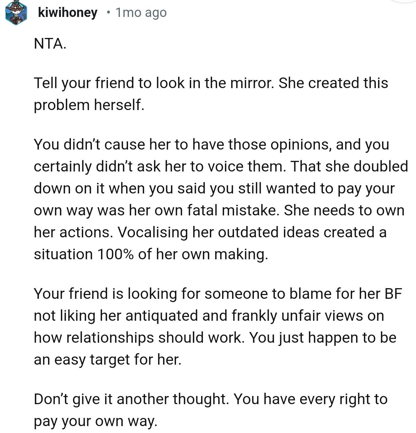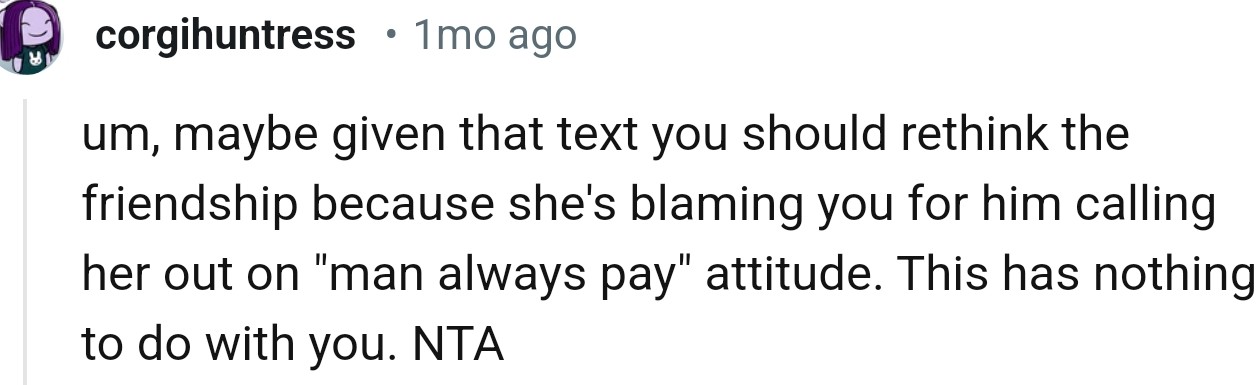 "You should rethink the friendship because she's blaming you for him calling her out on her 'man always pay' attitude."