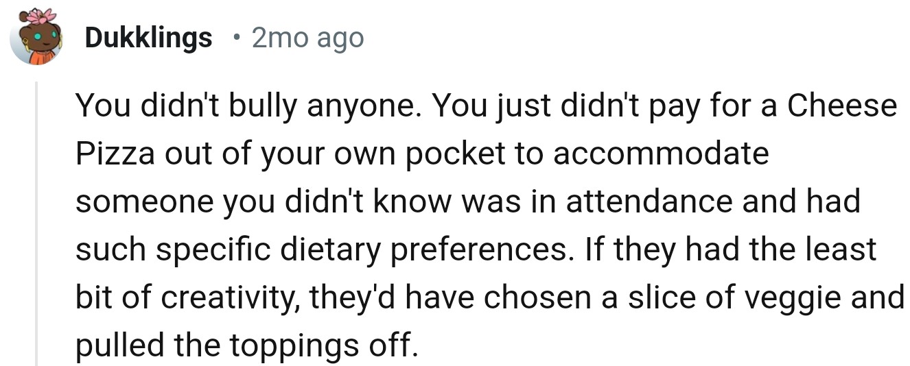 "You didn't bully anyone. You just didn't pay for a cheese pizza out of your own pocket to accommodate someone you didn't know was in attendance"