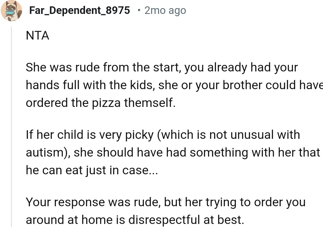 Ordering pizza wasn’t rocket science, so many wondered why the mom couldn’t do it herself. The consensus was clear: OP’s actions were reasonable under the circumstances.