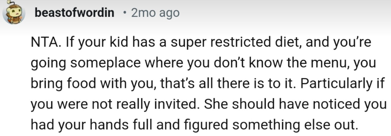 "If your kid has a super restricted diet, and you're going someplace where you don't know the menu, you bring food with you"