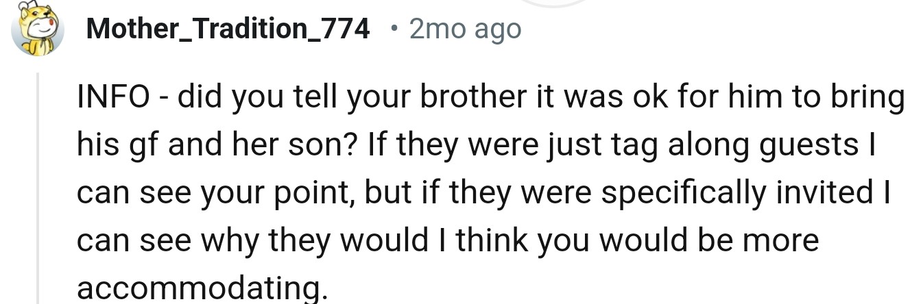 "Did you tell your brother it was ok for him to bring his gf and her son?