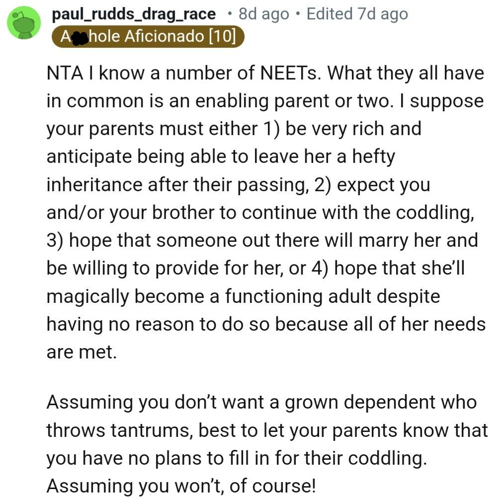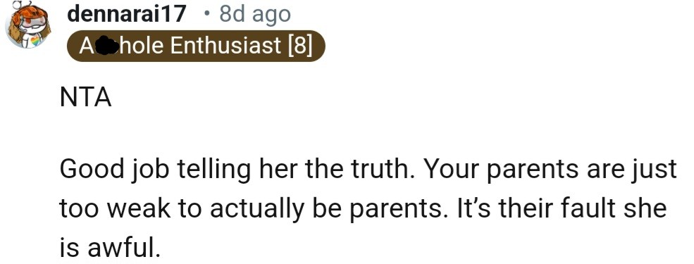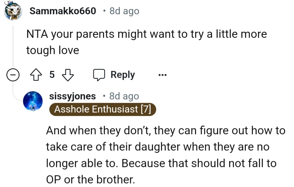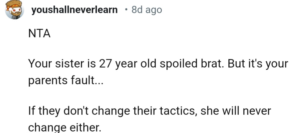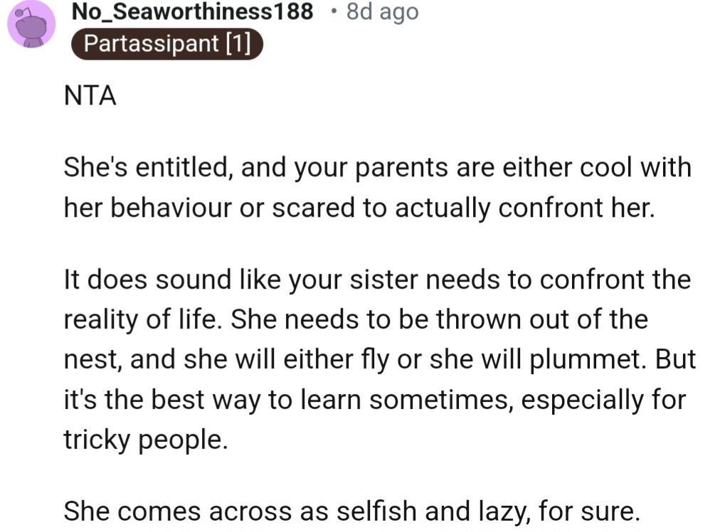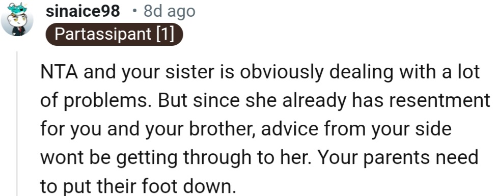 From OP’s perspective, the time for soft approaches had long passed—and Redditors were solidly behind her. Many accused the parents of enabling the sister.