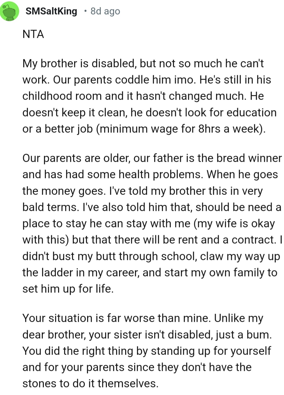 OP moved out at twenty while her younger brother was gearing up for independence. But her sister? She is stuck in a rut of laziness and entitlement, unwilling to get a job or contribute to the household.