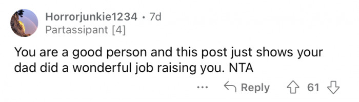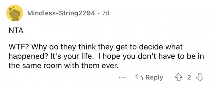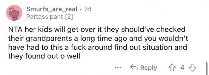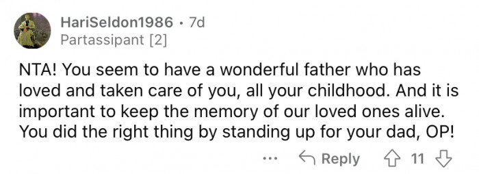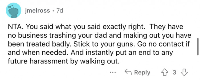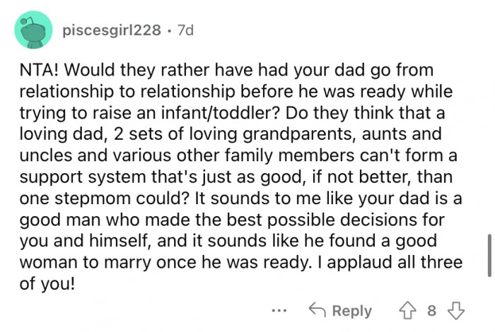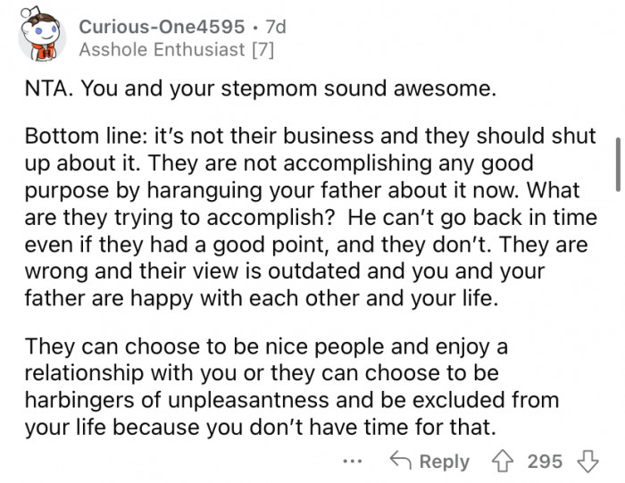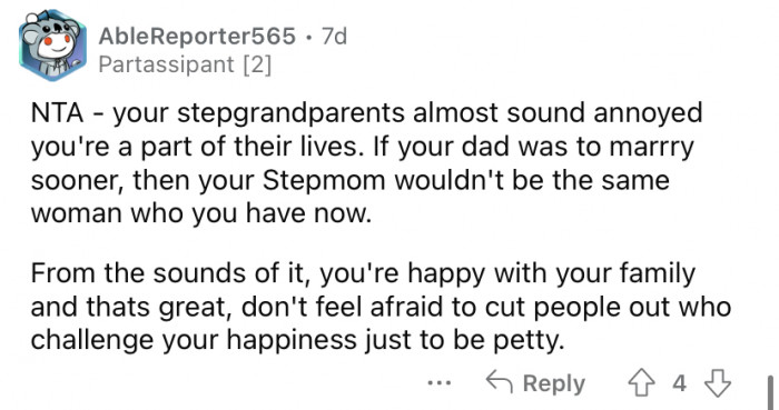 So, the Redditor told them that if they continued to harass her dad about this, they would not be welcome to attend any of her future milestones, like her graduation or wedding. Of course, they were not happy about the ultimatum, but OP's stepmother stood up for her and told them she was right.
