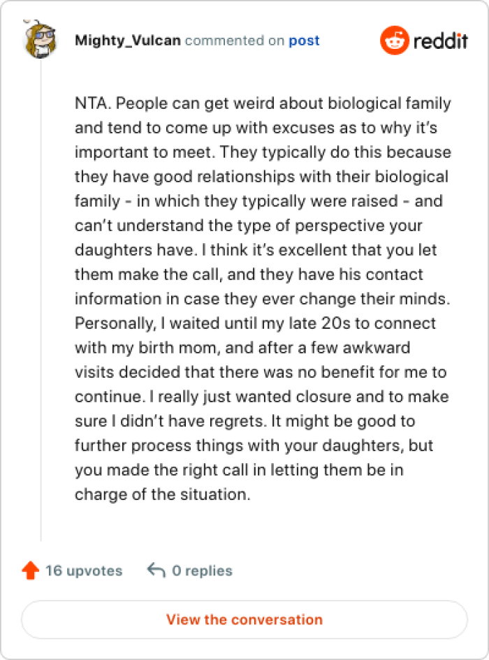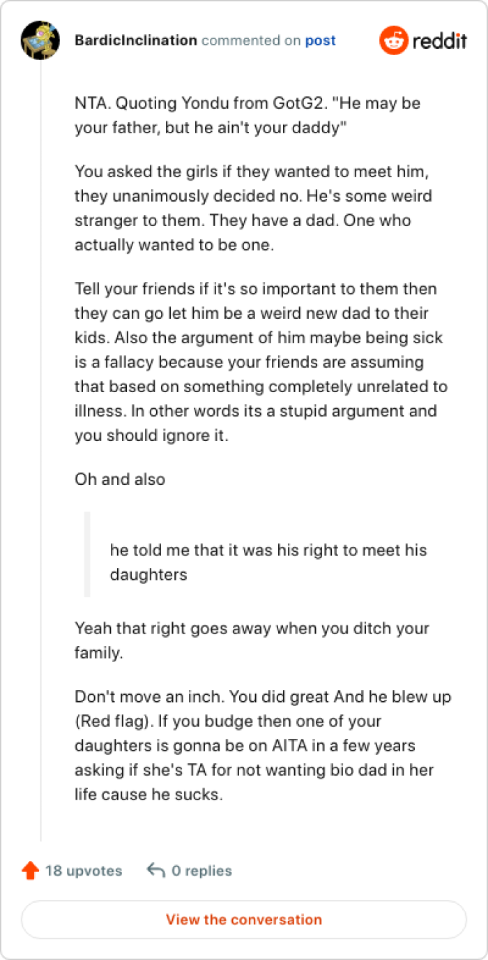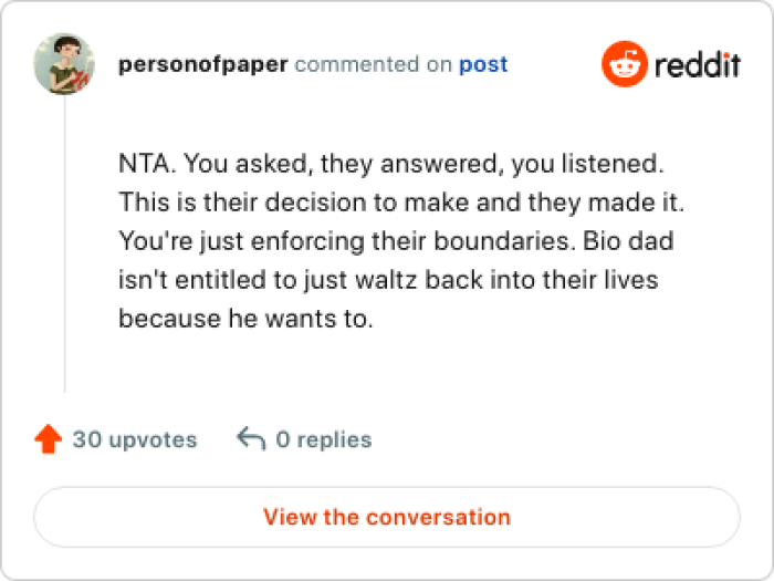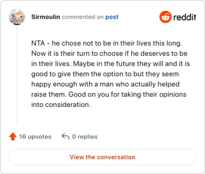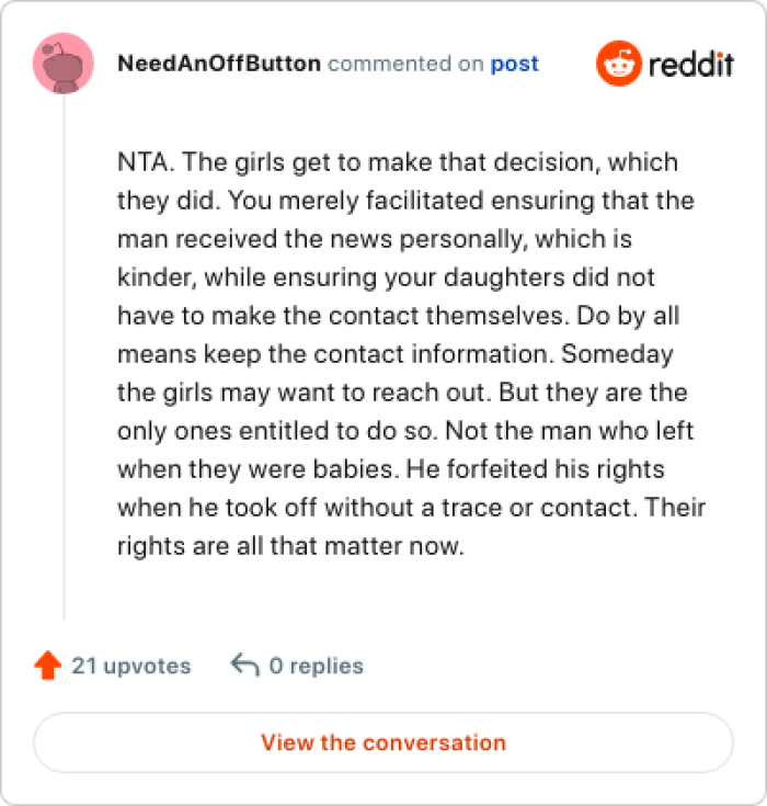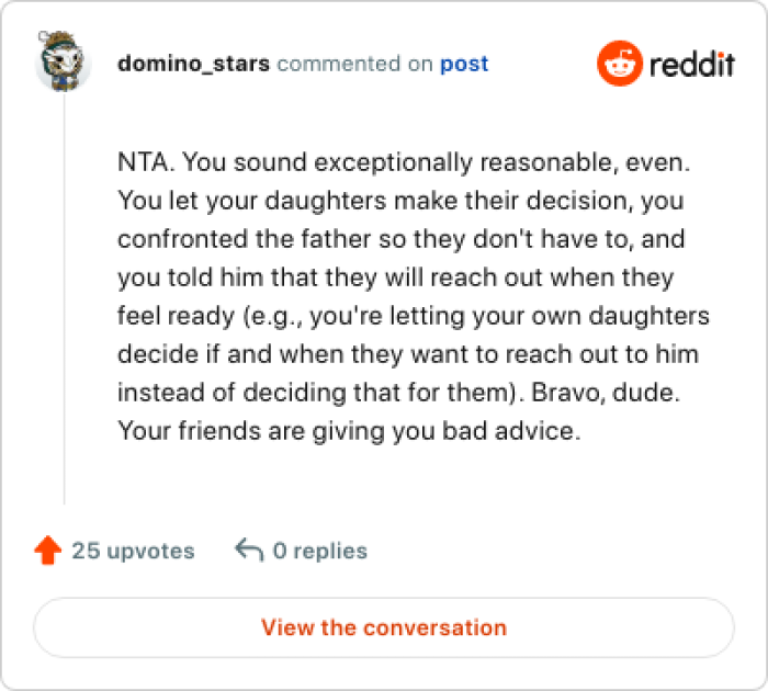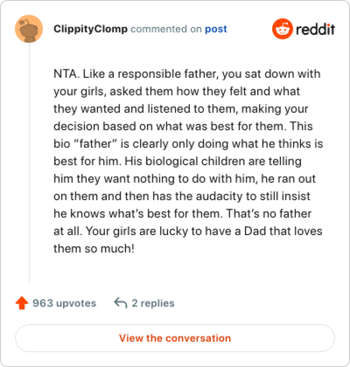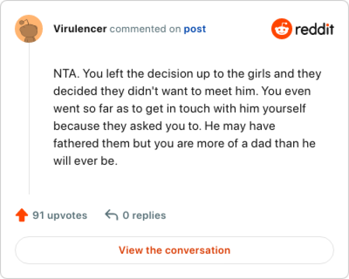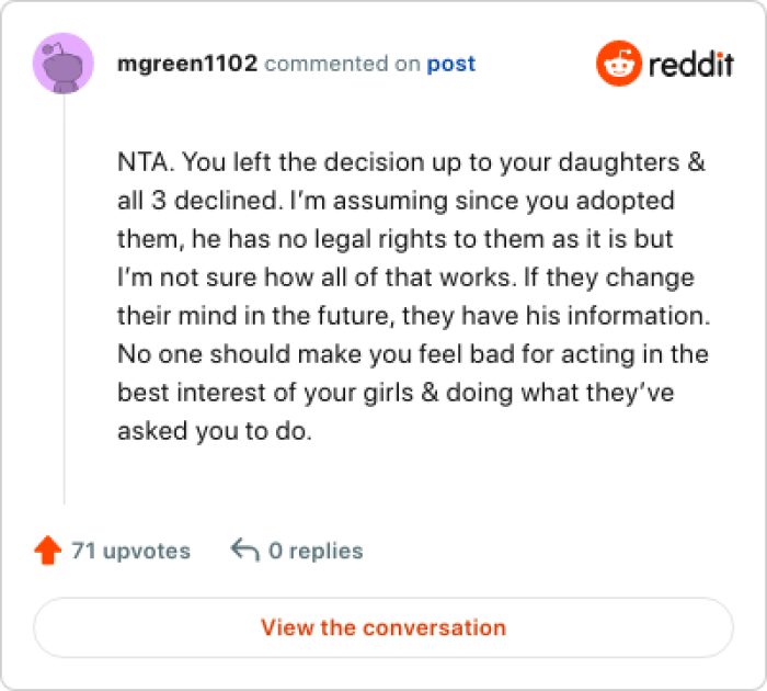 However, the middle daughter said she has no intention of connecting with her biological dad, and the other two daughters felt the same way. So, they requested that the OP intervene and have him stop contacting them.