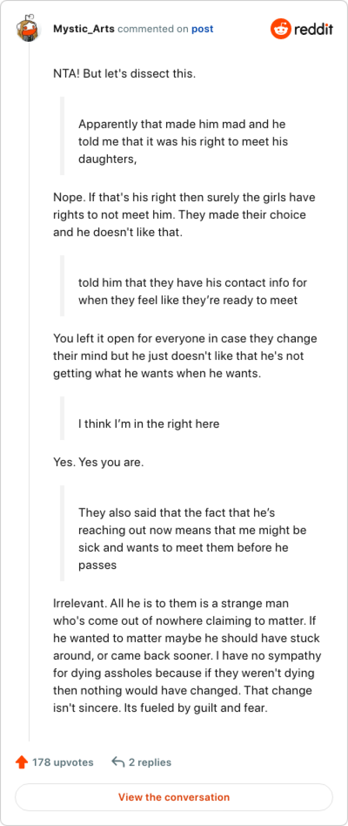 He believed it was his right to see his daughters and indicated that the OP might be keeping them away out of fear of losing them. The man has not attempted to make contact since.