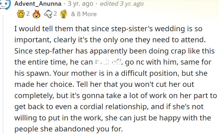 "Definitely don't invite your stepfather or stepsister to the wedding."