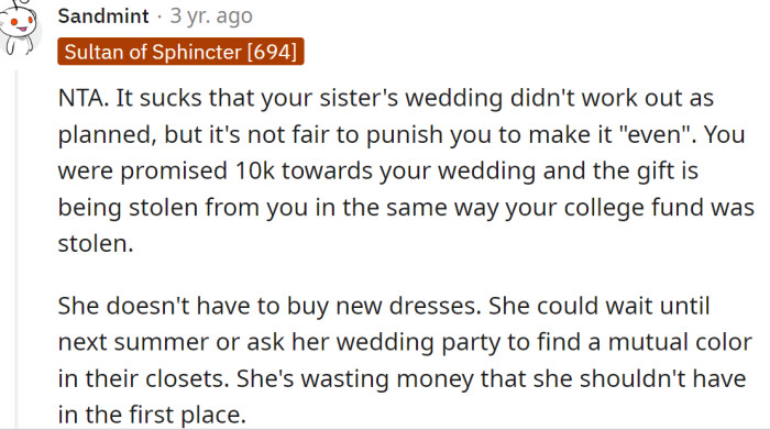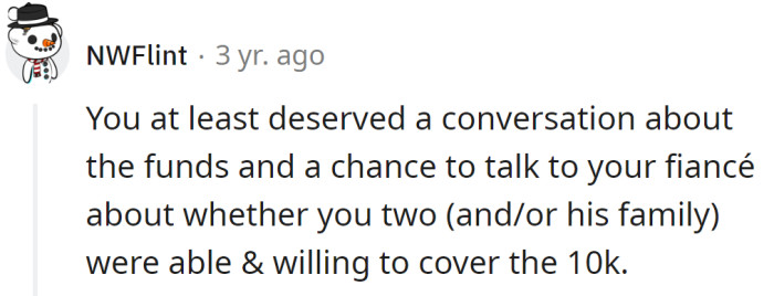 RedditShe also explained that her mother and stepfather had saved $10k for each child intended for their weddings.