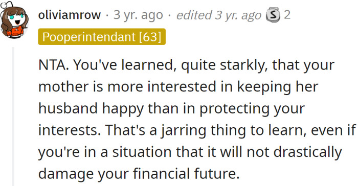 But her mother admitted that her stepdad had given that money to her stepsister, who had suffered financial setbacks due to the pandemic. The stepfather justified this decision by claiming that OP's fiancé came from a wealthy family who could cover the entire costs of their wedding.