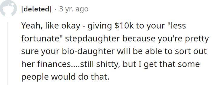 In this case, the decision to give wedding funds to the stepsister may have triggered such feelings, highlighting the emotional complexities of blended families.