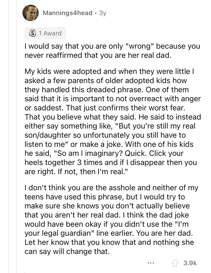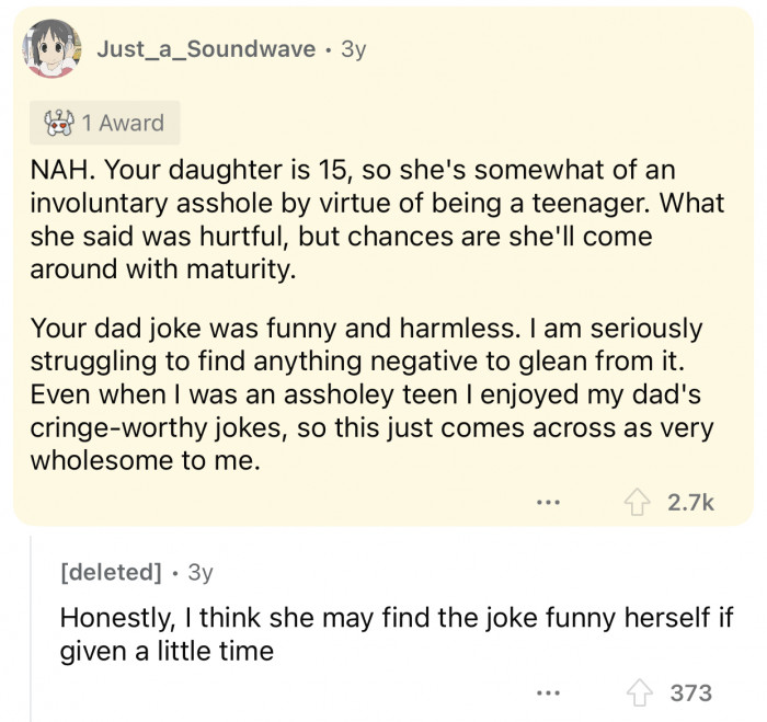 Teenagers can be rather mean, especially to their parents. It's a phase we all went through, and it's pretty much a universal experience everyone is familiar with. According to Dr. Daniel Kahneman, a behavioral economist, "Adolescence is a time of emotional turbulence, where the brain undergoes significant changes that can affect behavior and relationships." Parents can sometimes feel hurt by the comments their teenagers make, which can complicate their relationship and even ruin it in some cases. As noted by Dr. Madeline Levine, a child psychologist, "It's crucial for parents to remember that their teenagers are navigating their own emotional landscapes, often forgetting the impact of their words." It's a peculiar phase that transforms the household's vibes, especially if the teenager starts perceiving their parents as "the enemy." No one wants to see their house turned into a battlefield. A Redditor who goes by the username u/DadJokeAITA made a post on the r/AmItheA**hole subreddit where he explained how he made a "dad joke" that embarrassed his adopted daughter, whose father died before she was born. The timing was not ideal, considering the tense conversation they had before that, the way OP phrased the joke, and the nature of their relationship. The user doubted the way he handled the situation, so he decided to consult with the r/AmItheA**hole community, which had a lot of different reactions to the post. Scroll down to check out the full Reddit post, and scroll a little further to read the comments from the original post.