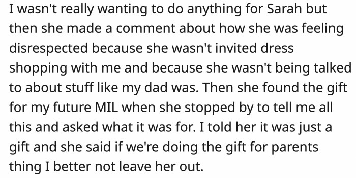 The couple was not planning to include Sarah in any of these plans or gift-giving until Sarah made a comment. Her dad's new wife said she felt disrespected because OP did not invite her to go dress shopping, and nobody was asking for her opinions like they do with OP's father.