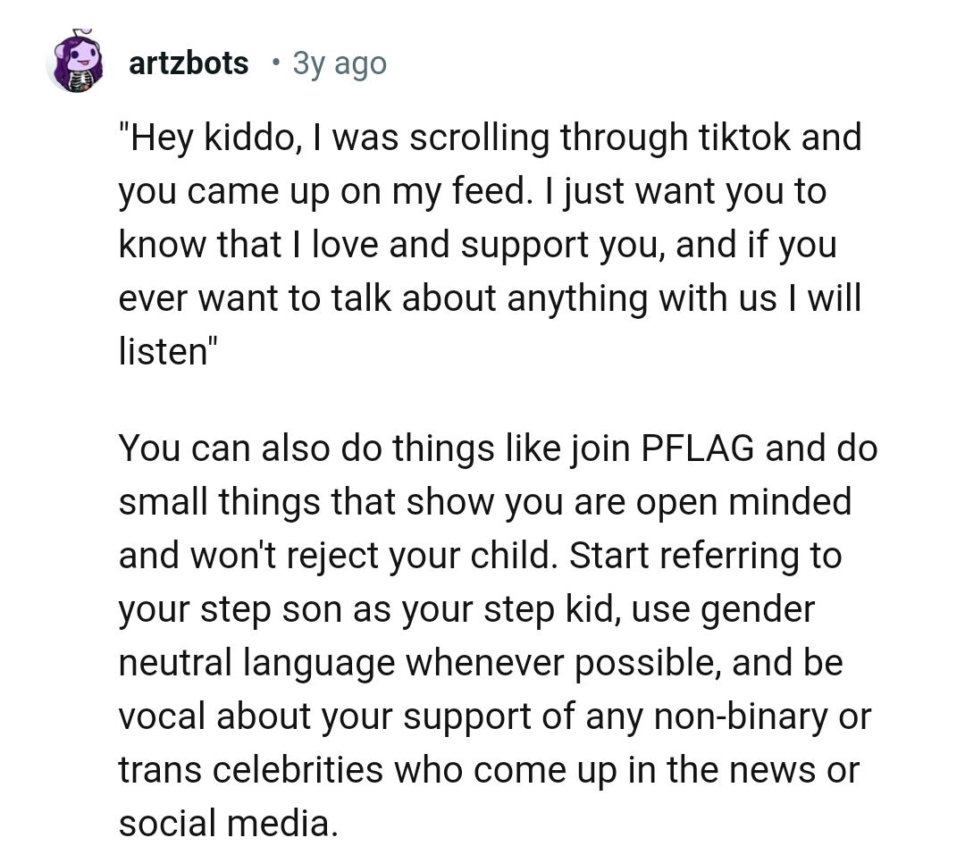 My stepson says he is bi on his public TikTok profile. Do I say something or let him come to me?We've gathered some of the most upvoted comments from other Redditors for you to read through below