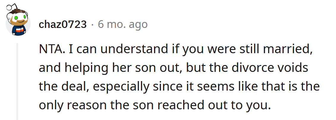 The OP told Troy that, unfortunately, things are different now that he and his mother are no longer married.
