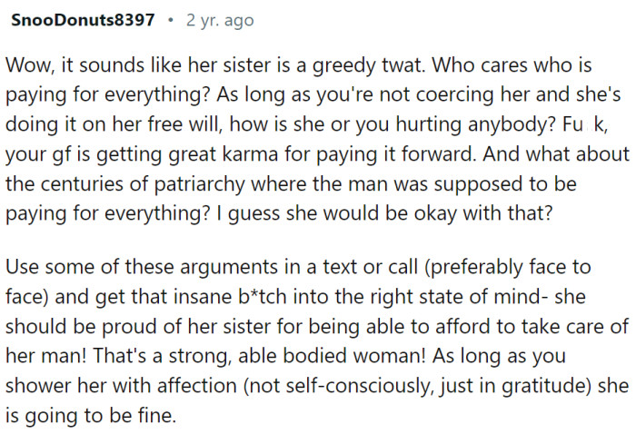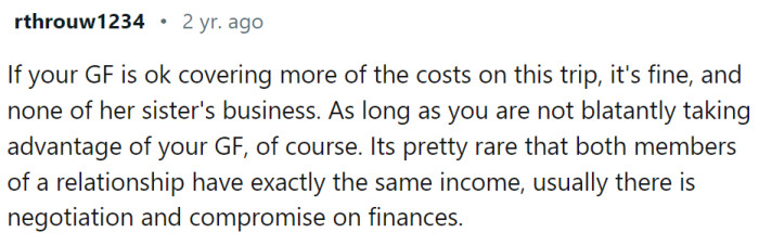 OP and his girlfriend seemed comfortable with how they were managing things, but her sister had an issue with it. This turned what should have been a fun vacation into a complicated mess, all because of her feelings about who was responsible for the expenses.