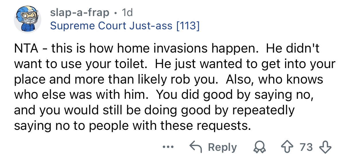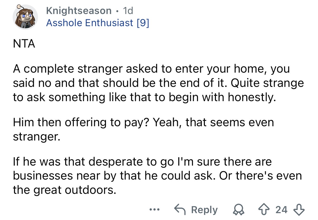 He politely declined, explaining that he wasn’t comfortable with someone he didn’t know using such a private space. The stranger, undeterred, even offered him $5 to sweeten the deal.