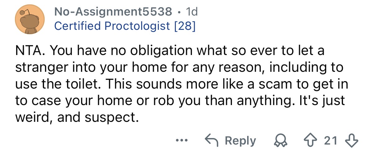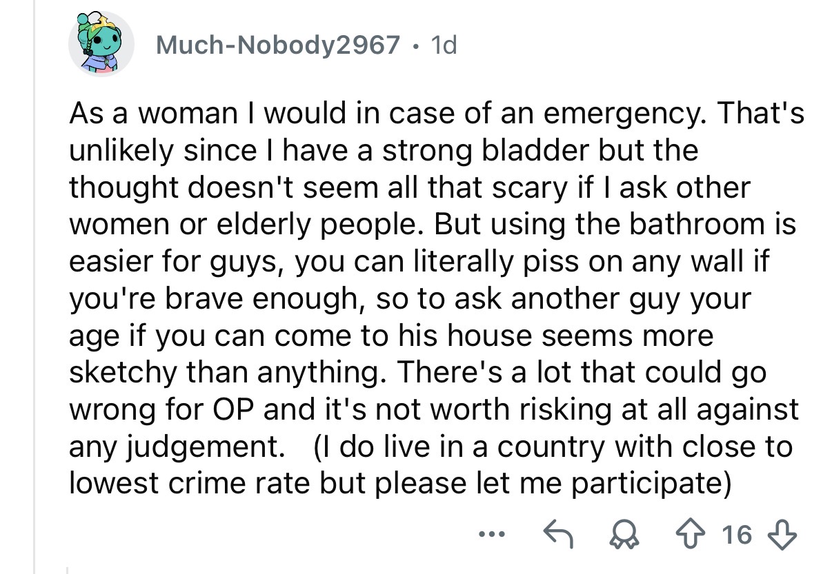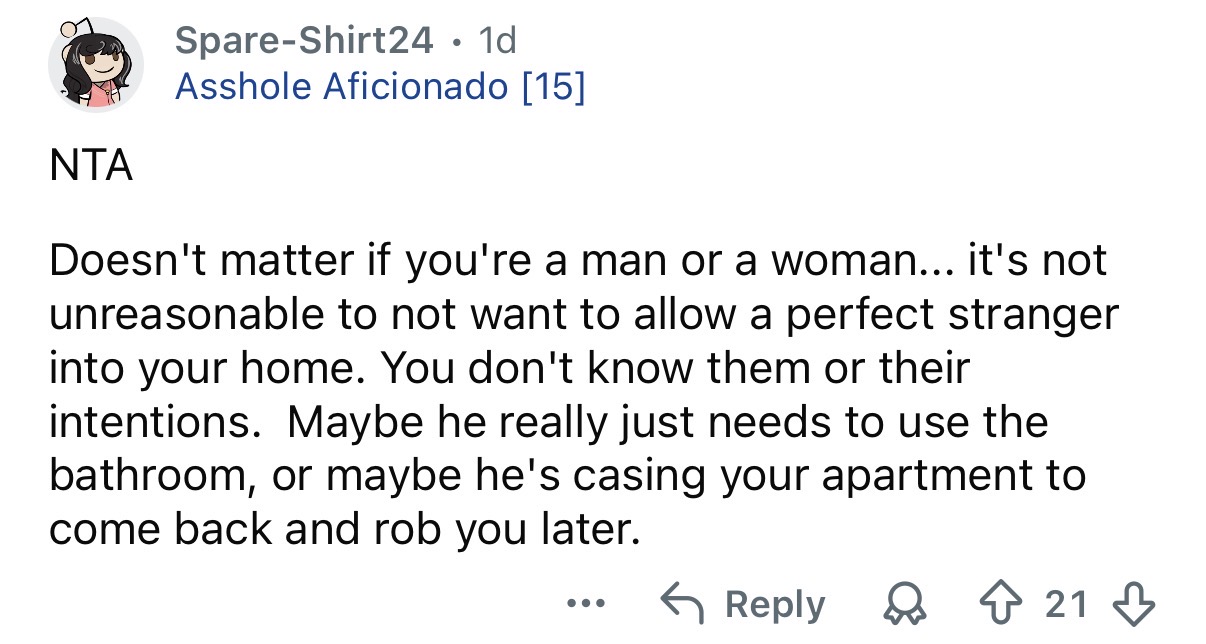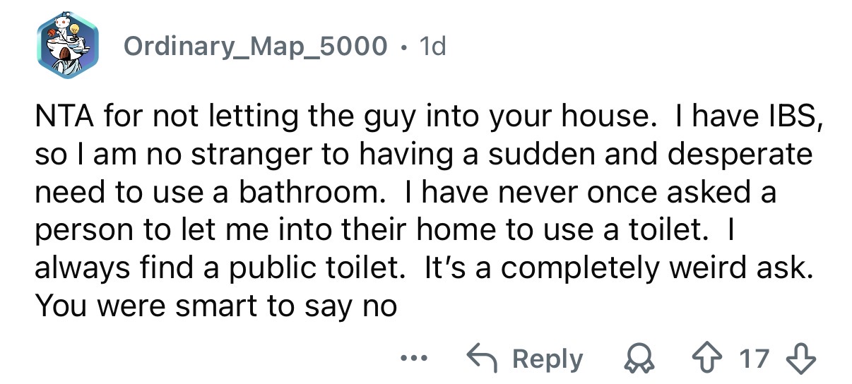Experts recommend asking clarifying questions before making a decision. For instance, asking the stranger about their situation can provide insight. If you still feel uncomfortable, suggesting a public bathroom nearby can be a safe alternative.