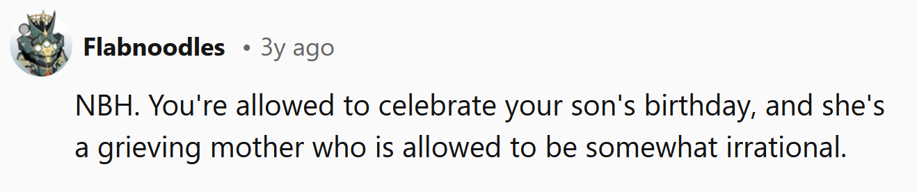 A little while later, the OP got another email from her calling him a "selfish prick" for being disrespectful about her son's death. Nevertheless, the OP and his wife continued to celebrate their son's birthday.