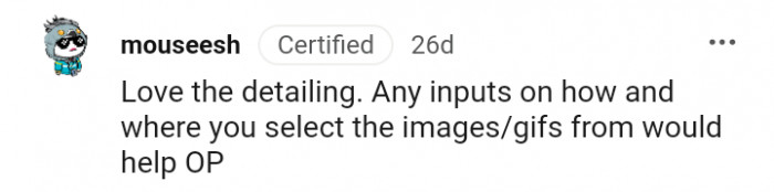 "Any inputs on how and where you select the images/gifs from would help OP"