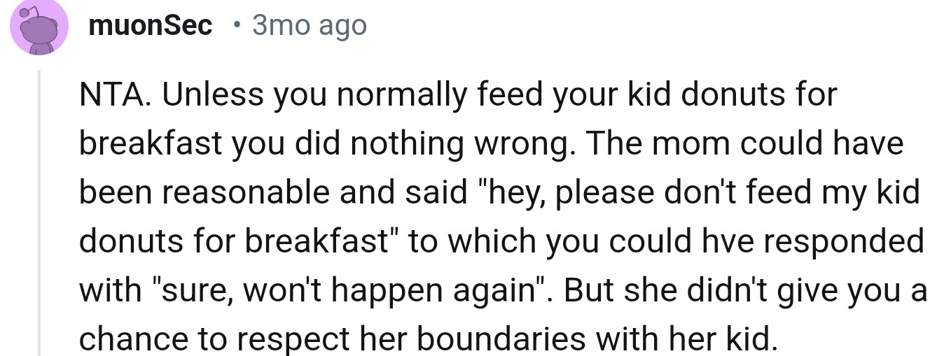 One of the boys must have mentioned the breakfast menu to his mom because soon after, OP received a strongly worded Facebook message. According to this very furious parent, donuts were a cardinal sin, and feeding them to children was practically a crime.