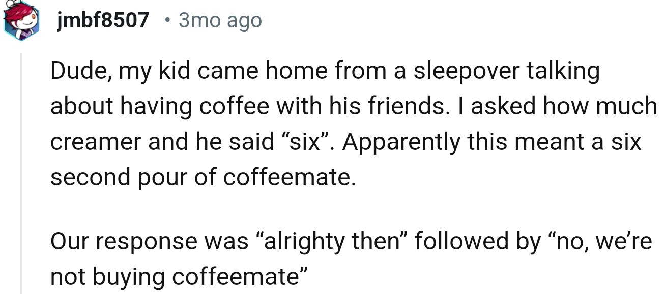 "My kid came home from a sleepover talking about having coffee with his friends."