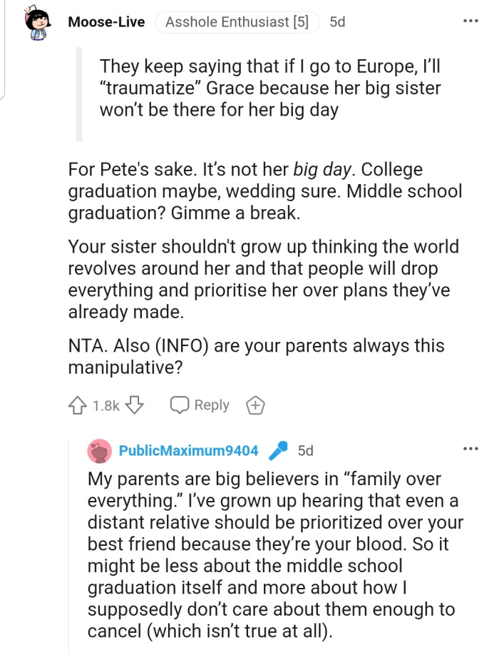 While the college senior is eagerly counting down the days until her European escapade, her younger sister, Grace, is on the cusp of a significant milestone in her life—her middle school graduation. Unfortunately, due to unforeseen scheduling issues, the ceremony has been unexpectedly rescheduled to take place after OP's departure.