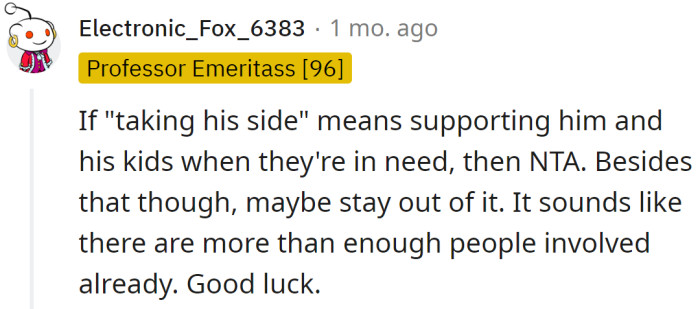 Regarding this story, Redditors agreed with the OP that she has the right to support her son in his decisions, regardless of the reasons. They understand how his life turned bleak, and he's choosing to divorce because he is far too unhappy.