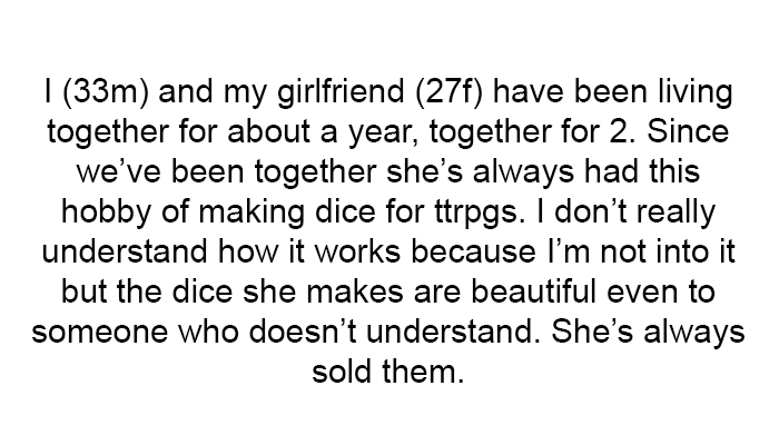 A steady relationship exists despite their different interests. His 27-year-old girlfriend has a passion for making beautiful dice sets for tabletop role-playing games (TTRPGs), a hobby that has always fascinated him.