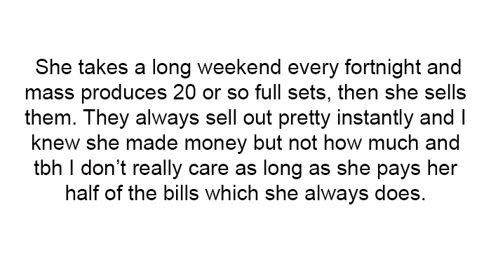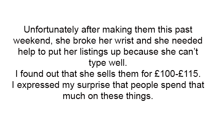 She dedicates long weekends every fortnight to mass-produce around 20 sets, which always sell out quickly. However, after she broke her wrist and needed his help to list her products, [Username] was taken aback to discover that she sells each set for £100-£115.