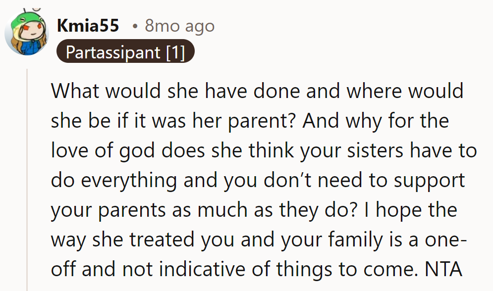 She joined for the hospital visit but blamed his dad and insisted his sisters help, sparking an hour-long argument.