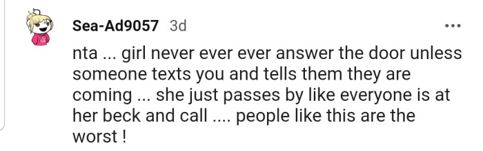 "Girl, never ever answer the door unless someone texts you and tells you they are coming."