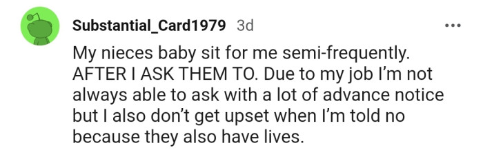 "My nieces babysit for me semi-frequently. AFTER I ASK THEM TO."