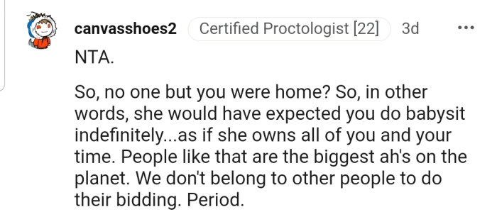 In this case, the aunt’s expectation for free babysitting without prior discussion can be seen as an overstepping of boundaries.