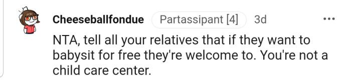 "NTA...Tell all your relatives that if they want to babysit for free, they're welcome to."