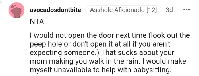 "That sucks about your mom making you walk in the rain. I would make myself unavailable to help with babysitting."
