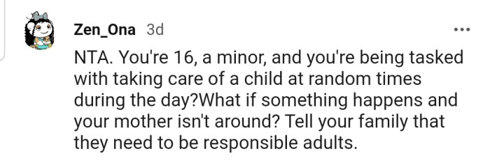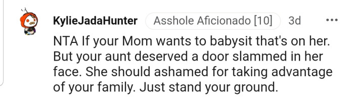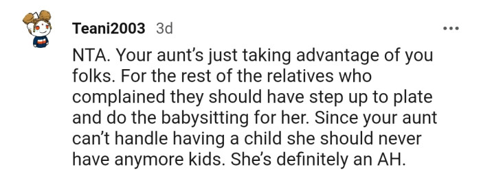 According to them, OP only deserves the NTA title, as her aunt was wrong for expecting OP or her mum to babysit her child without informing them beforehand.