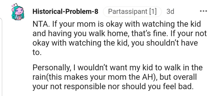 "If your mom is okay with watching the kid and having you walk home, that’s fine. If you’re not okay with watching the kid, you shouldn’t have to."