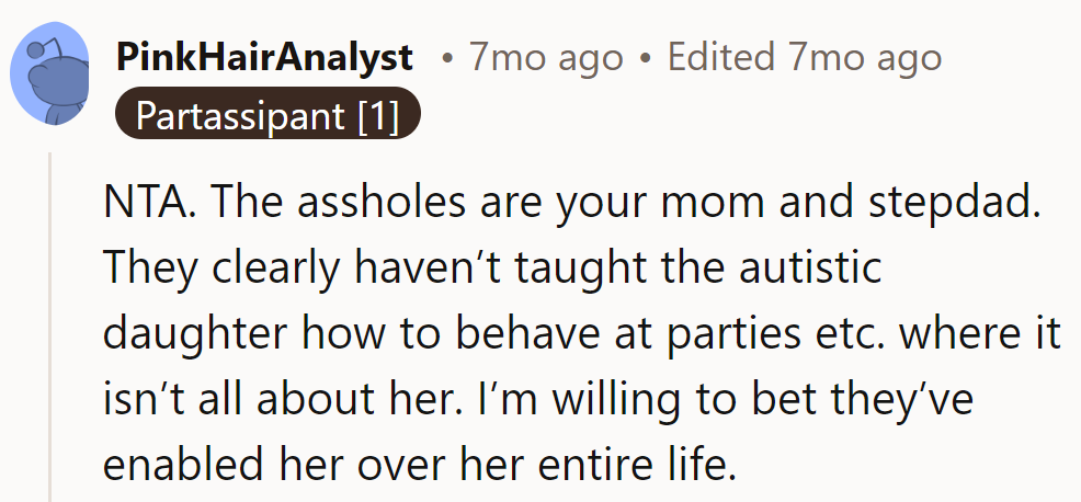 RedditAutistic stepsister disrupted past parties. Now, turning 16, she's having a bigger bash funded by Dad, inviting Mom and stepfamily.