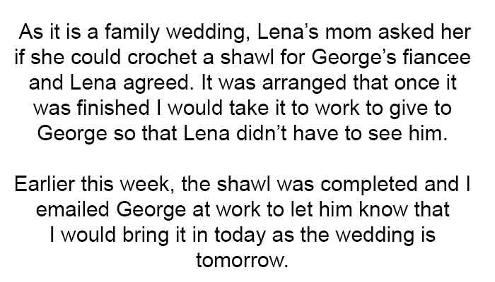 The narrator's wife, Lena, enjoys crocheting shawls for family weddings. Despite having a distant relationship with her oldest brother, George, due to past abuse, she agreed to make a shawl for his fiancée. However, after the shawl was completed and delivered, Lena was uninvited to the wedding, although her husband was still invited. Feeling used, the husband took back the shawl from George's desk at work. Lena's family criticized her, calling her petty, though the husband believes they don't deserve Lena's kindness.