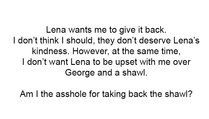 This conflict raises important questions about respect, boundaries, and the value of kindness. What do you think about the husband’s decision to take back the shawl? Was he right to protect his wife’s feelings, or should he have handled it differently? Share your thoughts and let us know how you would navigate such a scenario.
