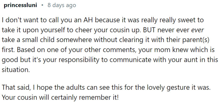 They had a fantastic time, and his cousin perked right up. But when they got back home, OP received an earful from his mom and aunt.