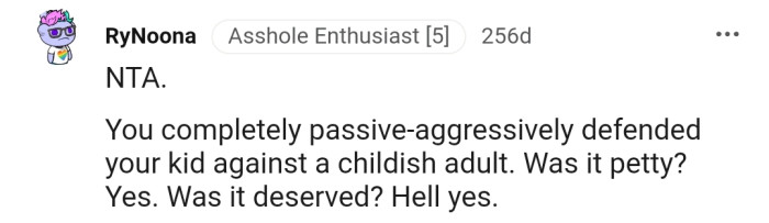 "NTA. You completely passive-aggressively defended your kid against a childish adult"