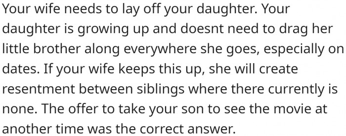 "The daughter is growing up and doesn't need to drag her little brother along everywhere she goes, especially on dates."