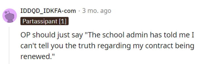 RedditUpon the school's announcement of their departure and introduction of OP's successor, many parents inquired about the reason, to which they responded that their contract had not been renewed.