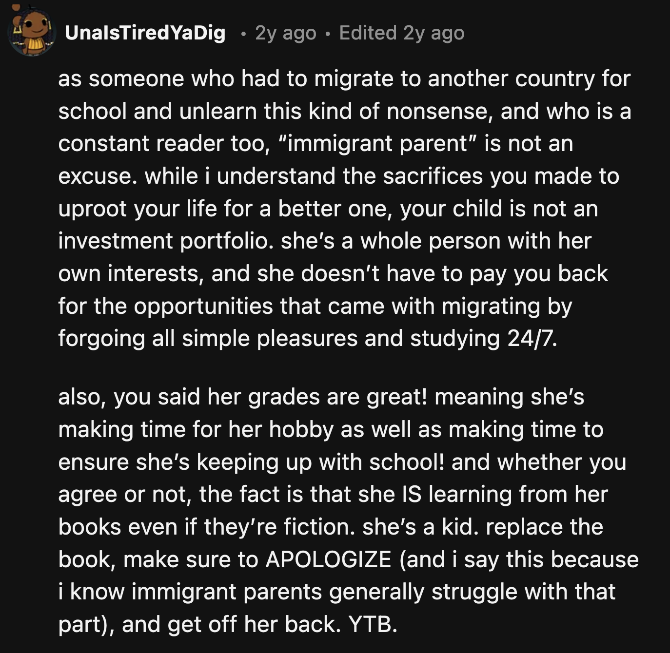 OP expressed frustration as an immigrant parent at seeing his daughter spend so much of her time on a "good but ultimately useless" hobby. He believed his daughter used her hobby as an excuse to neglect her studies.