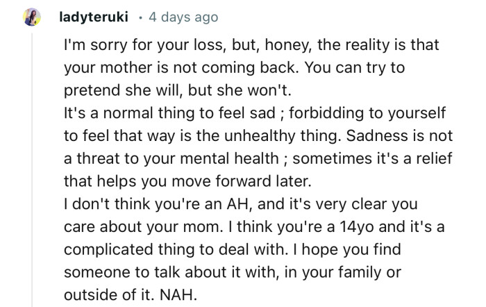 Right now, OP was at the emotional sweet spot—he missed his mother, but he was pretty much okay. He didn’t want to risk a nosedive into sadness that mirrored his dad's current state.